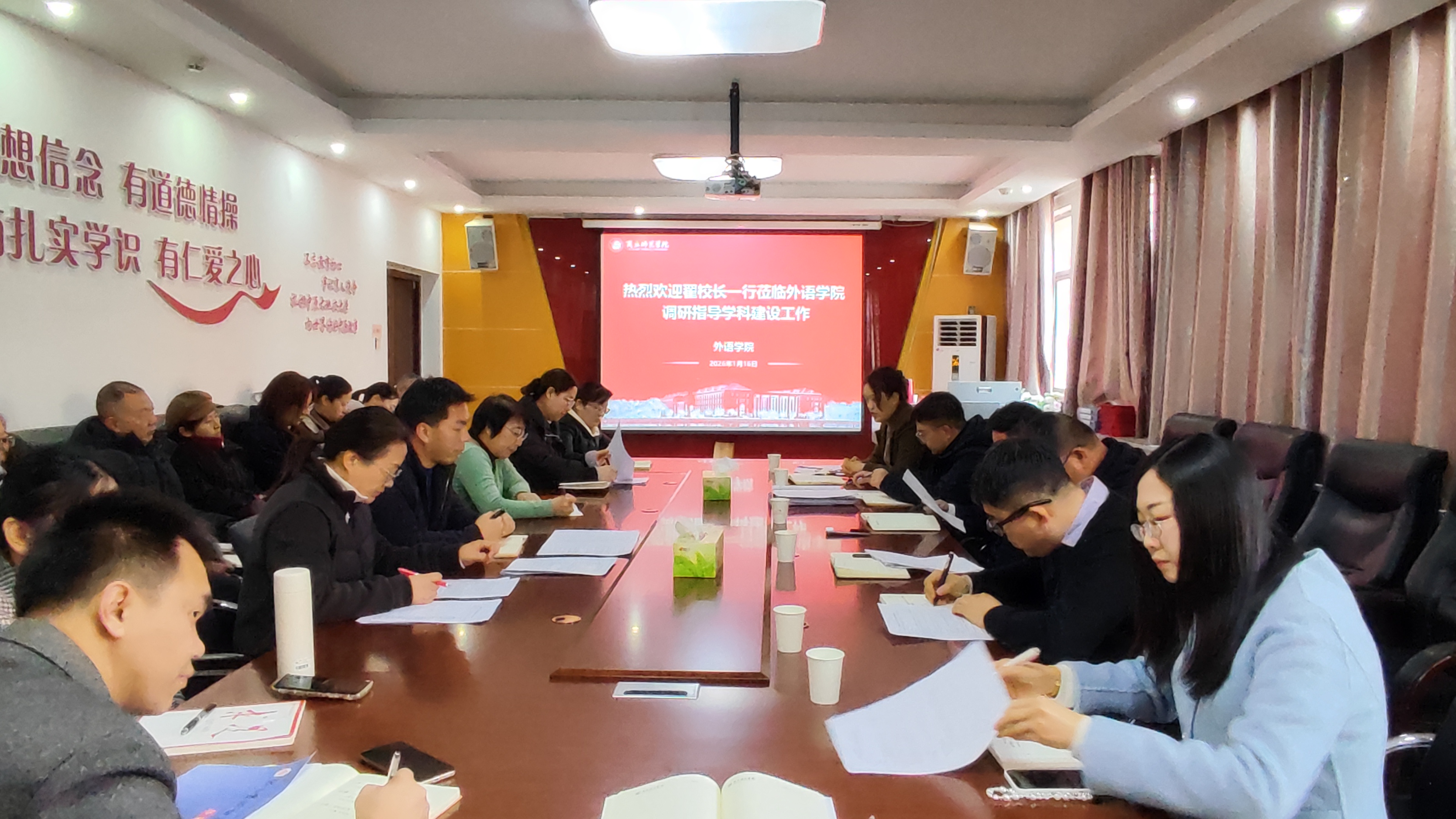 为精准推进学位点建设,夯实学科发展根基,2026年1月16日上午,副校长翟滨、发展规划处处长孙旭、学科建设科科长冷春蔚一行莅临世界杯体育官方网站调研指导学科建设与学位点规划工作,调研工作在世界杯体育官方网站214会议室进行,世界杯体育官方网站领导班子、各系主任及高级职称教师参加了会议,会议由世界杯体育官方网站院长杨静主持。